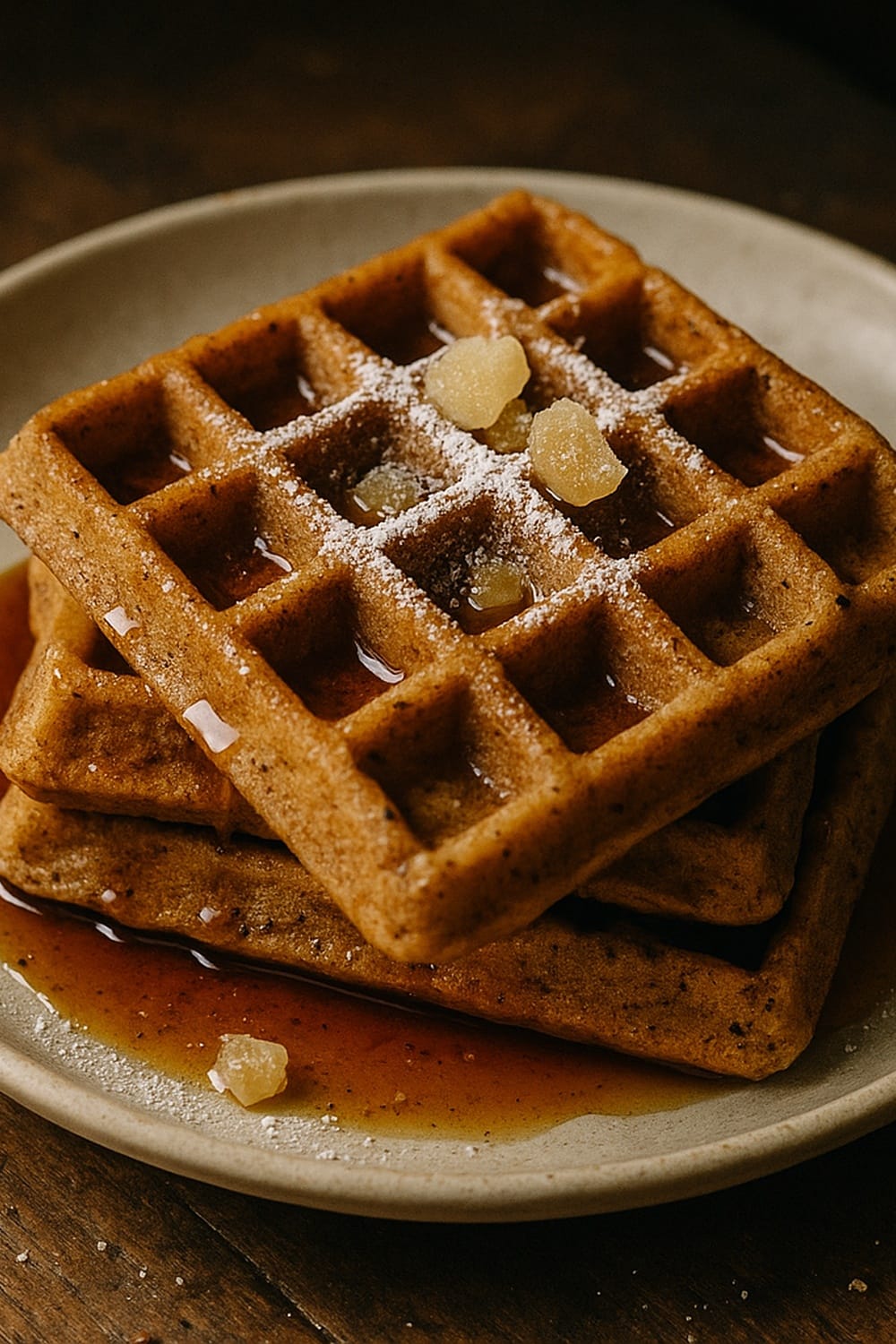 Make festive gingerbread waffles topped with warm maple syrup drizzle in minutes; perfect for a cozy breakfast or brunch.