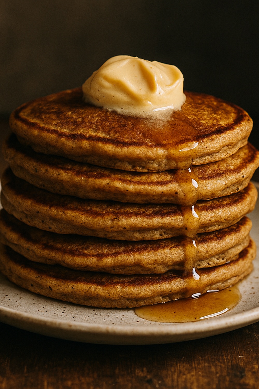 Fluffy pumpkin spice pancakes topped with warm maple butter drizzle—easy fall breakfast made in 30 minutes with canned pumpkin, spices and pantry staples.