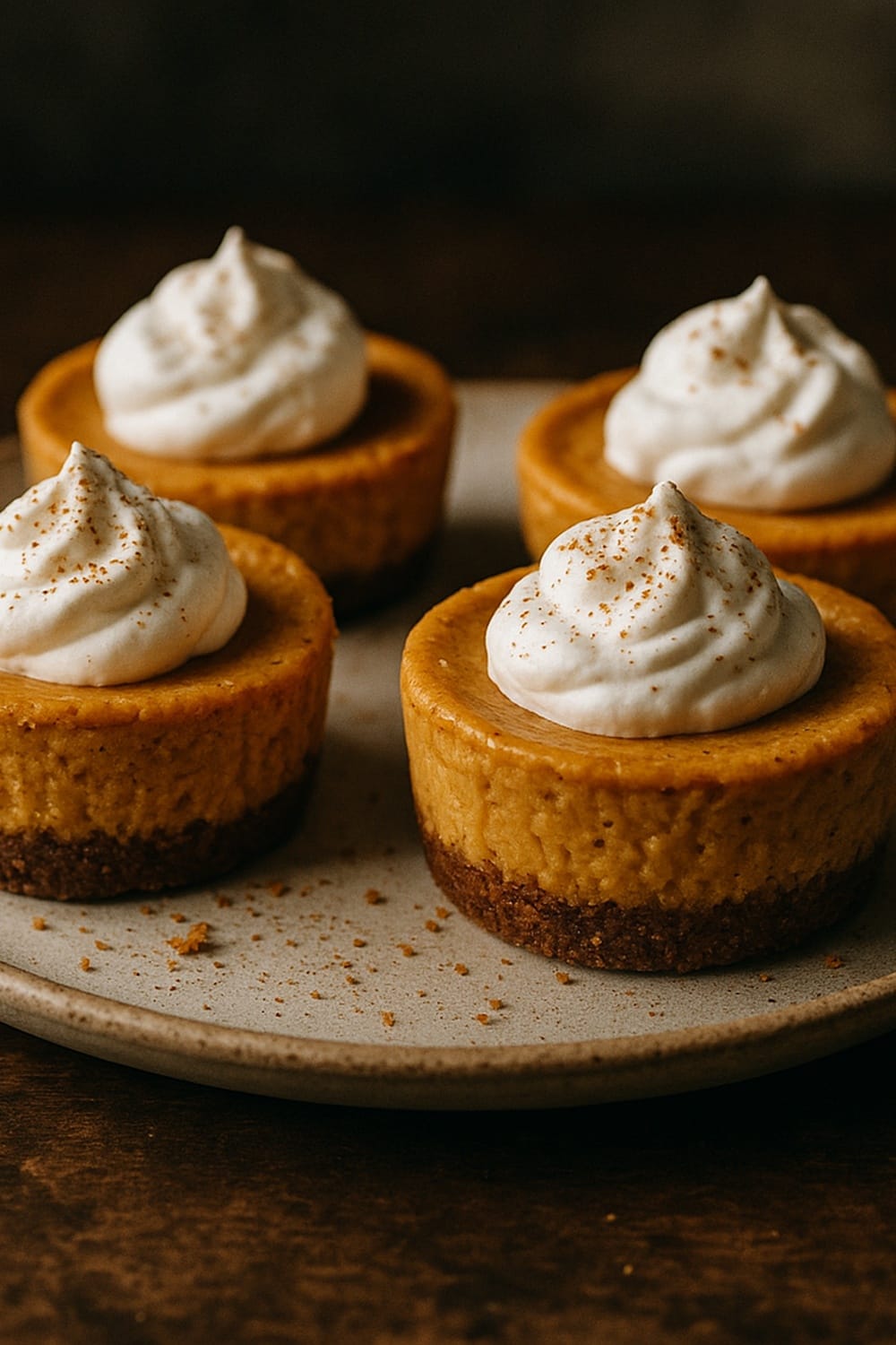 Individual pumpkin cheesecake bites on a spiced gingersnap crust; an easy make-ahead dessert for autumn parties and Thanksgiving.