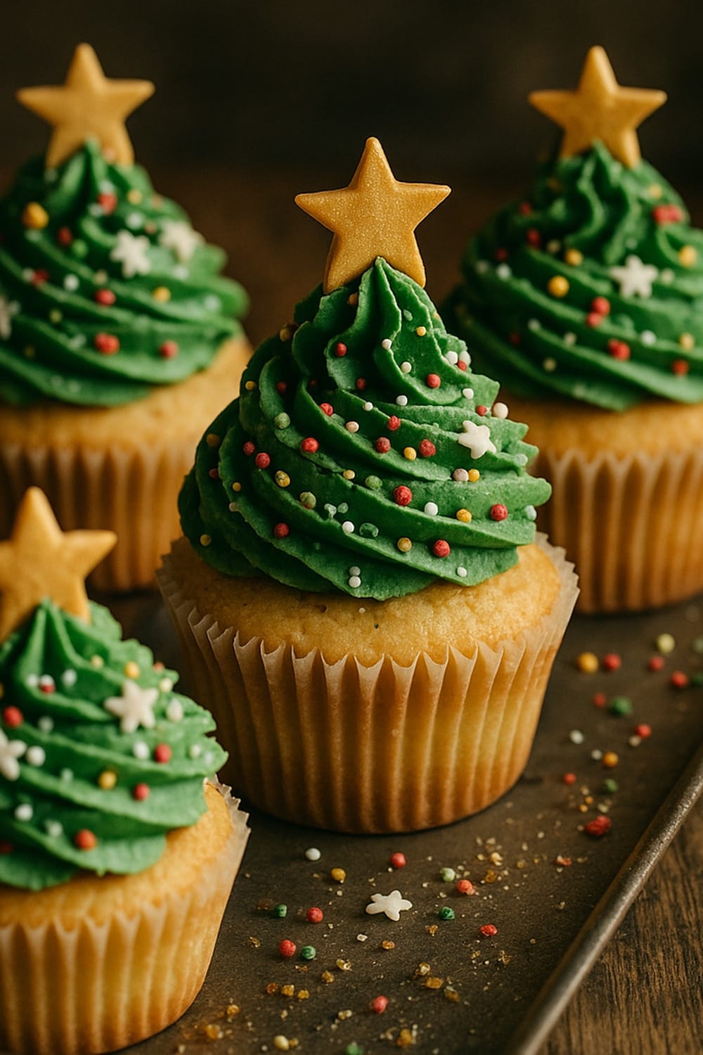 Bake festive Christmas tree cupcakes topped with creamy buttercream frosting, perfect for holiday dessert tables.