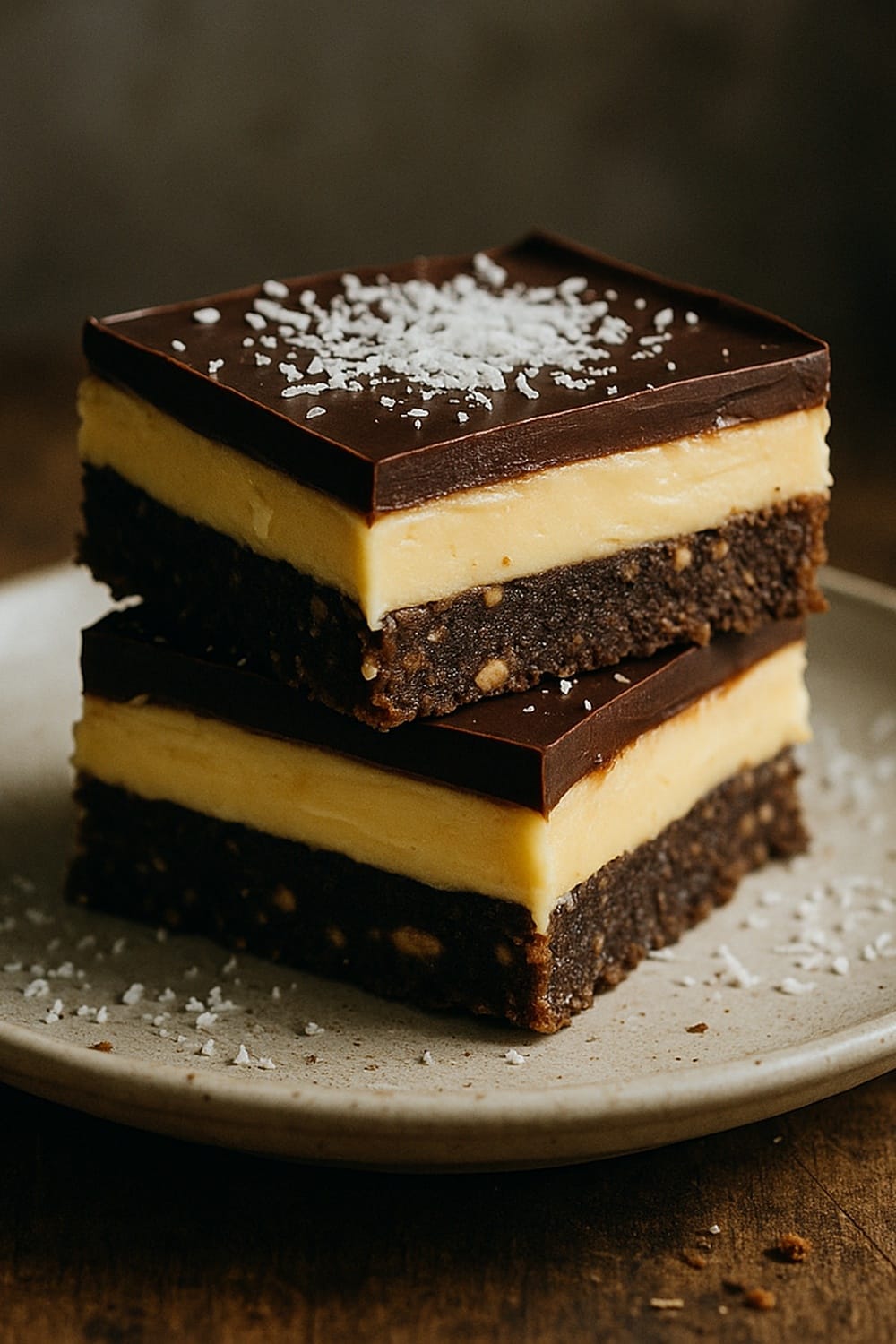 Make rich Chocolate Coconut Nanaimo Bars at home with layers of cocoa, coconut, custard, and ganache. Easy no-bake dessert bar recipe.