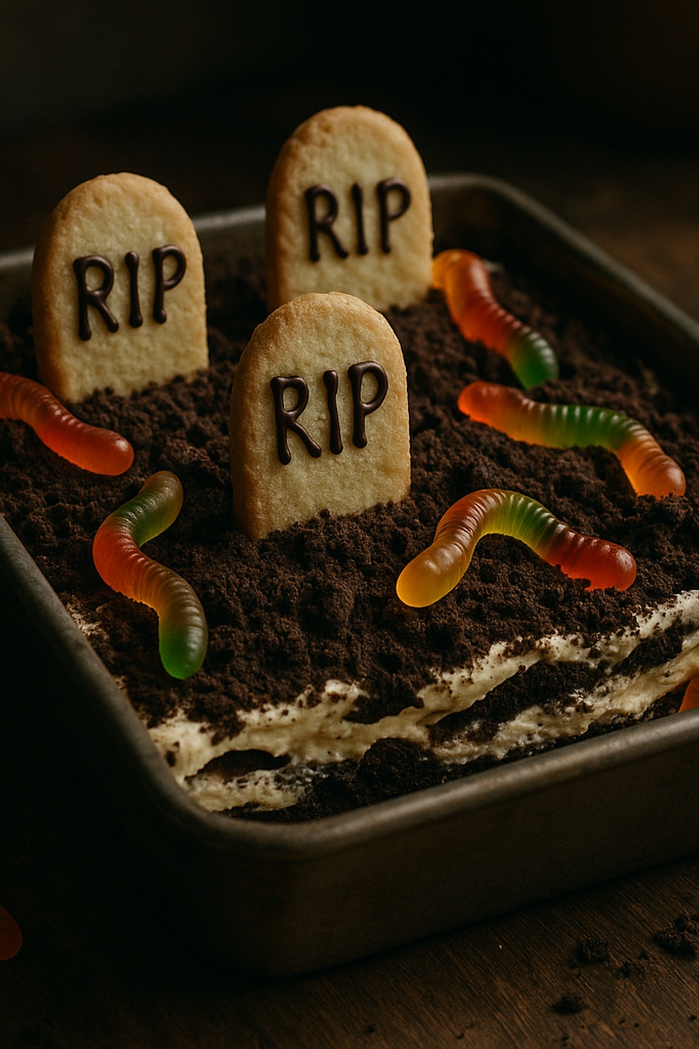 Make an easy Oreo dirt cake layered with chocolate pudding and topped with gummy worms for a spooky graveyard dessert. Try this recipe tonight.