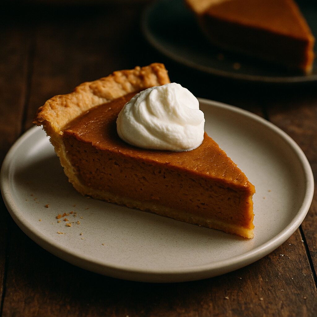 Silky spiced pumpkin filling in buttery crust, baked till set; the quintessential Thanksgiving pie topped with whipped cream.