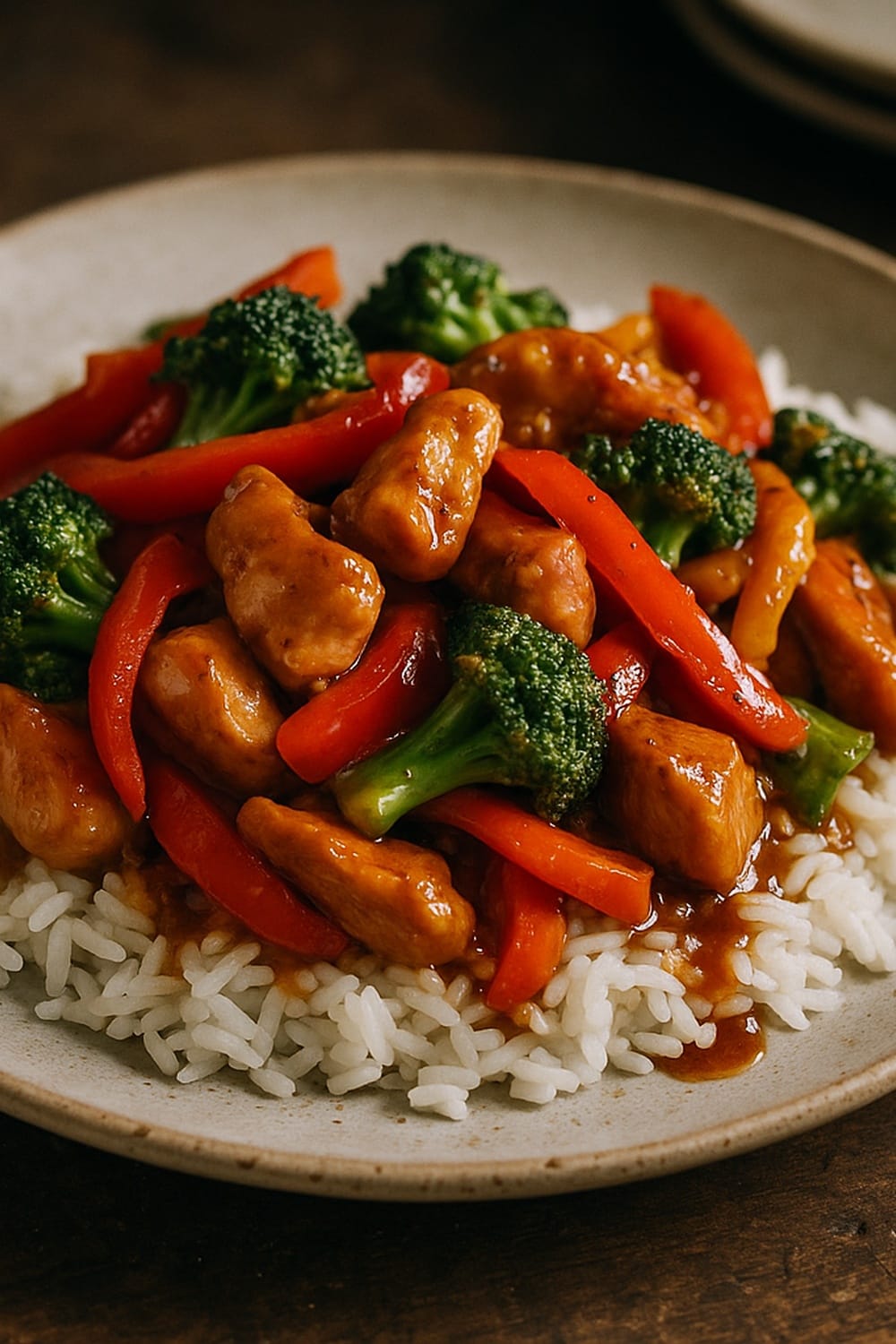 Quick chicken stir fry recipe with broccoli, bell pepper and a savory soy-garlic sauce, ready in 25 minutes.