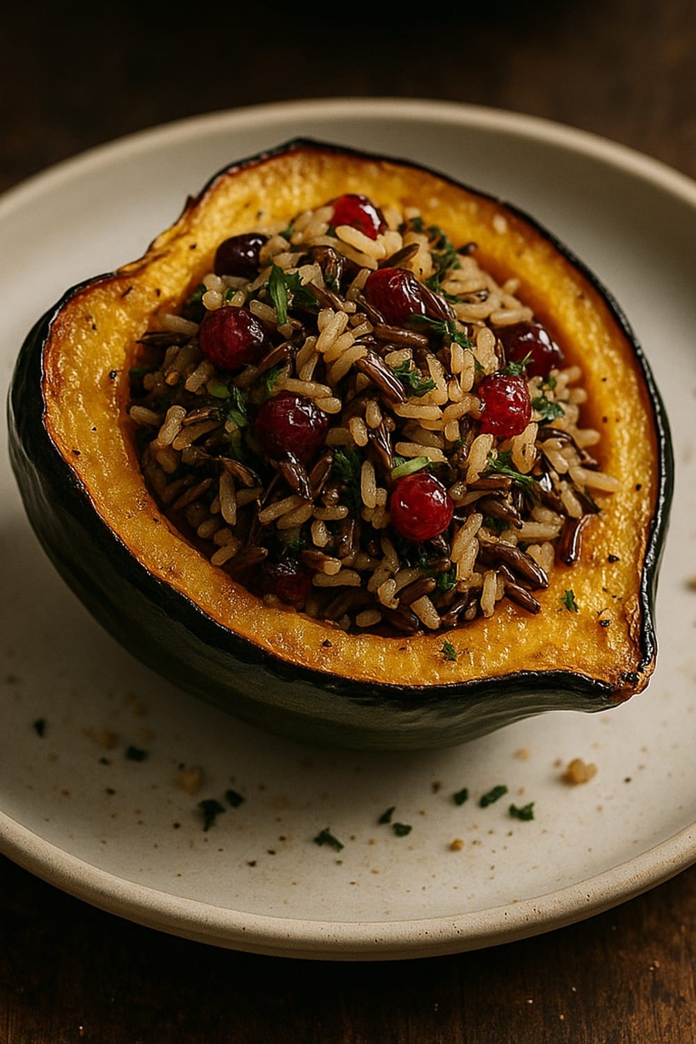 Bake acorn squash halves filled with savory wild rice, cranberries, nuts and herbs for a festive vegetarian main or flavorful holiday side dish.