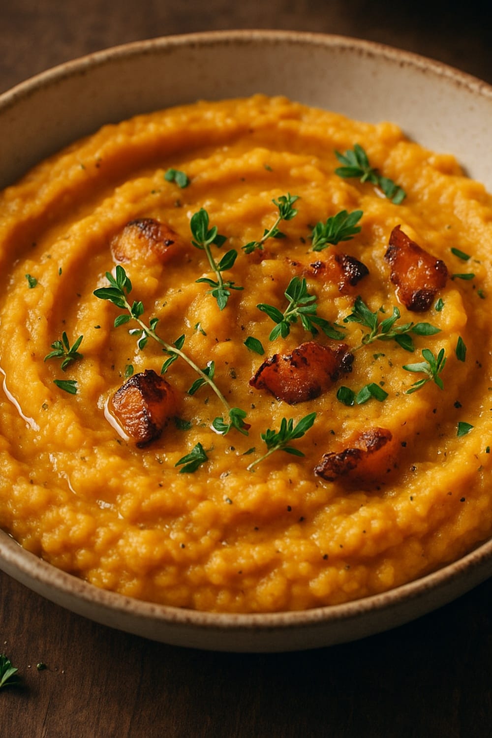 Creamy roasted pumpkin mash recipe seasoned with garlic and thyme, perfect as an easy autumn side dish or Thanksgiving alternative to mashed potatoes.