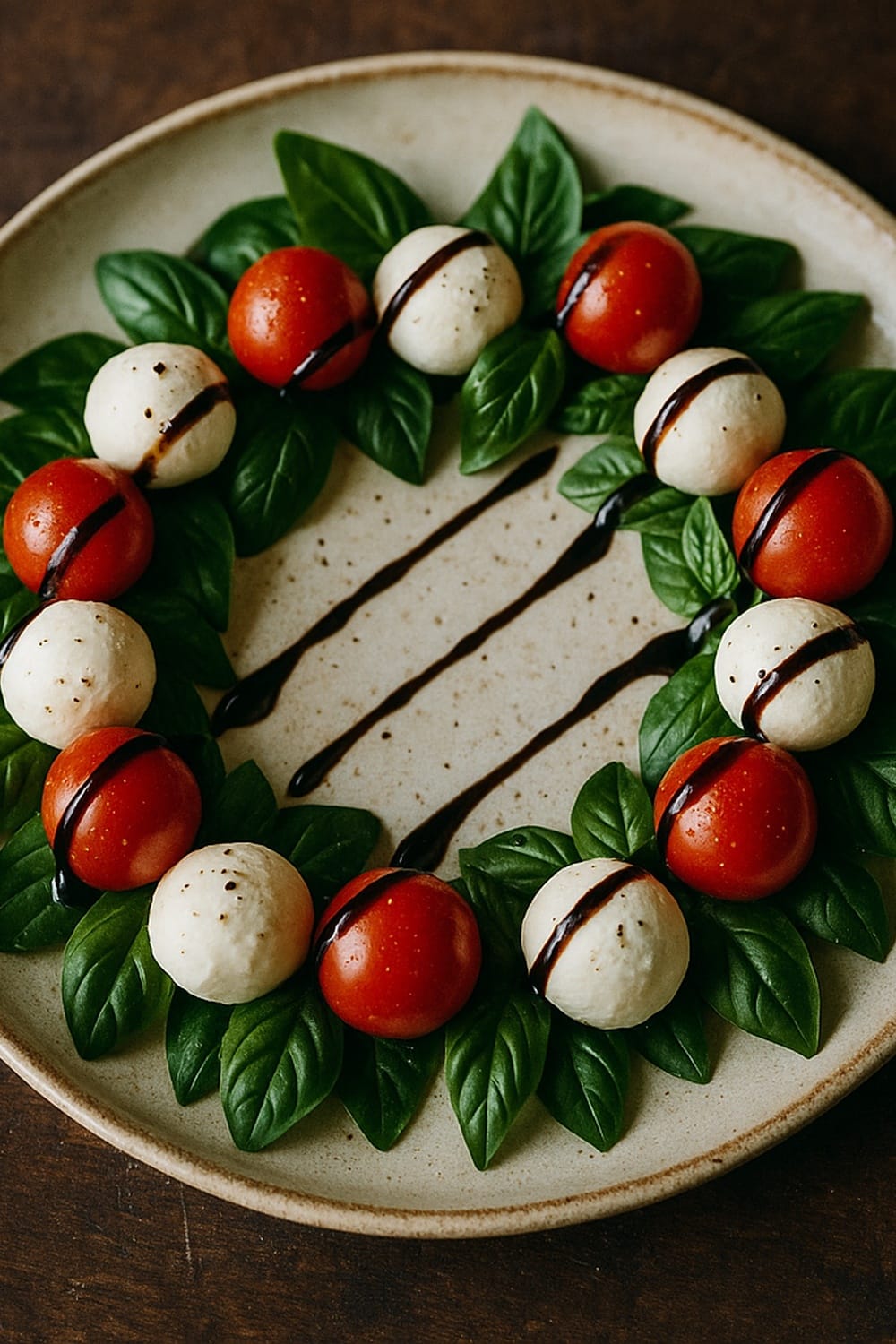 Craft a Caprese Christmas wreath appetizer with mozzarella, cherry tomatoes, basil and balsamic glaze—an eye-catching bite for any holiday gathering.
